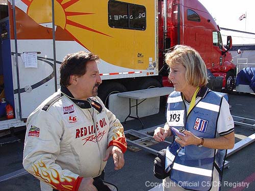 Registry reporter Janet Curran chats with Speed GT winner Lou Gigliotti. | Dave Hill and
